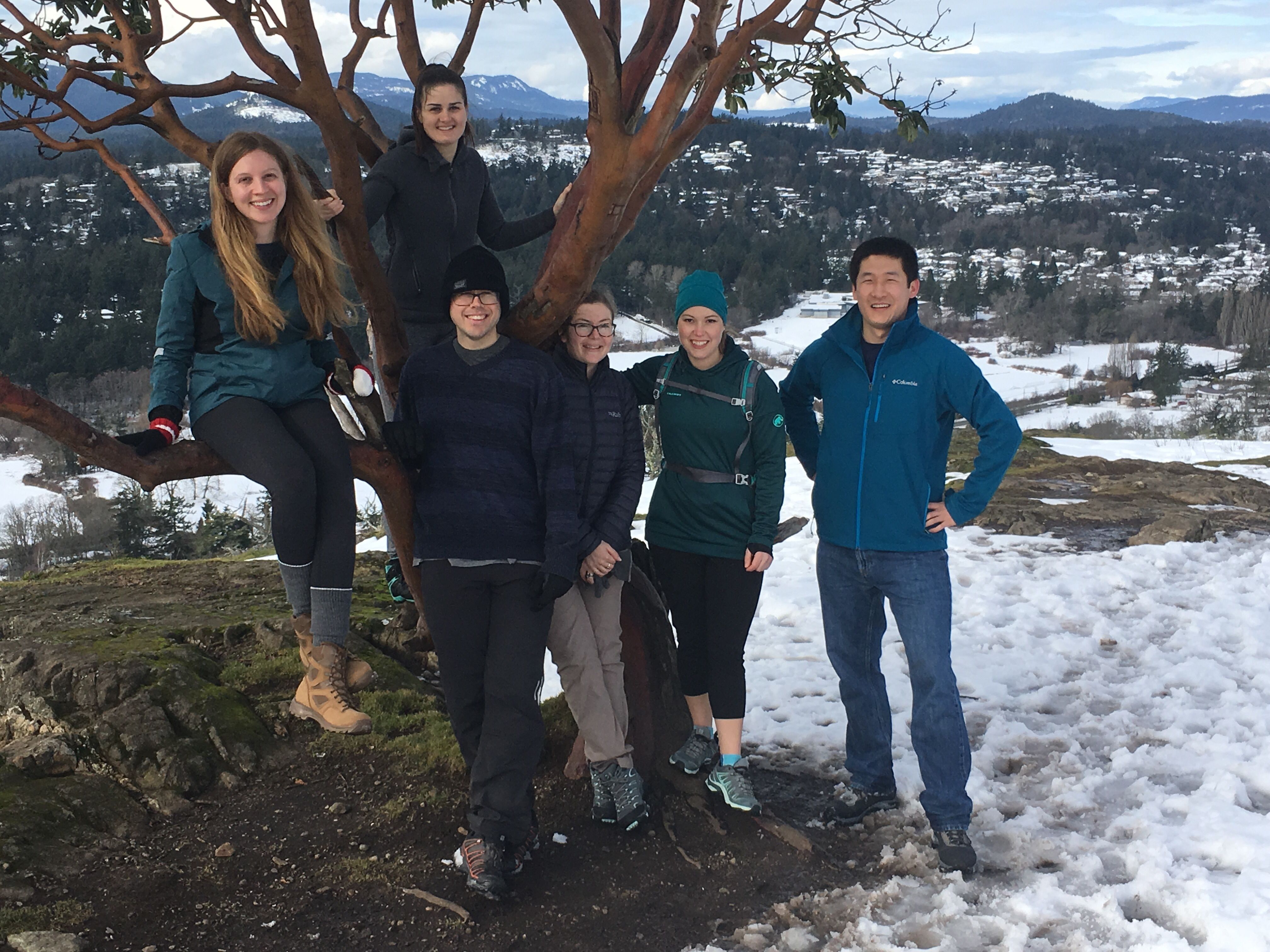 This was a pleasant yet fairly short walk, though not without its difficulties. I joined a meetup group in Victoria to find walking buddies and it turned out to be great idea. I met a lady called Erin and her cute dog to get a lift to the trail head. We were originally going to walk elsewhere but when we arrived everyones cars were getting stuck in the snow. We ended up having to push Erins car out of a snow bank which was amusing if a little time consuming. We all (about 11 of us in various vehicles) hastily decided to head to the much more well trodden Mount Douglas route. When we finally all made it over there we strolled up a very icy path to the top. Towards the top it was more sliding and climbing with lots of laughs involved. We had some snacks and pictures at the top before descending. The views of Victoria in the sunshine were great and the sun was warm despite the still lingering snow. It was good to meet some new people and find yet another nice Victoria trail.